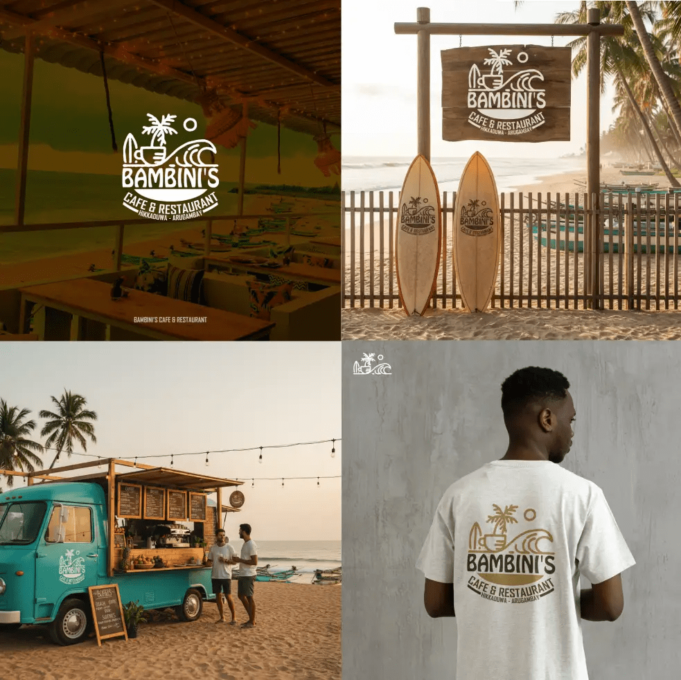 Bambini’s Cafe & Restaurant, located in the iconic surf hubs of Hikkaduwa and Arugambay, required a visual identity that resonated with the lifestyle of beachgoers and coffee lovers. The goal was to create a “vacation-state-of-mind” brand that feels both rustic and premium. I developed a comprehensive identity system including a hand-drawn illustrative logo and a suite of lifestyle collateral that positions the cafe as the ultimate destination for “the only shots you need”—espresso and surf.