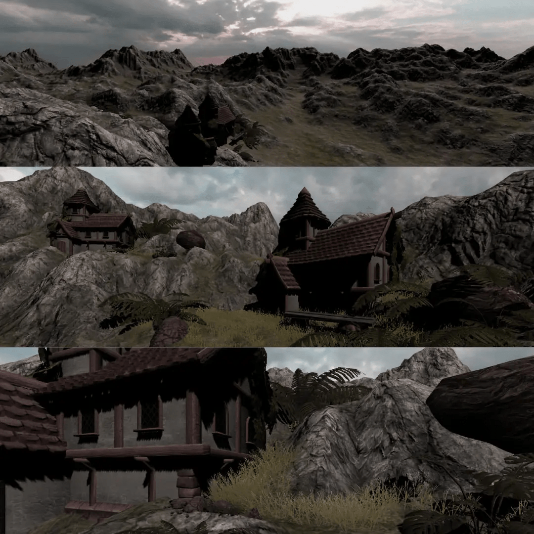 To overcome these challenges, I utilized a heightmap-based terrain system paired with custom rock and foliage assets to create a natural, eroded look for the mountains. I implemented a modular workflow for the cottages, allowing for quick iteration of building layouts while maintaining a consistent architectural style. For the lighting, I used a combination of global illumination for the overcast daytime scenes and high-contrast point lights for the night-time “glow” effect in the windows, guiding the player’s eye toward safe zones.