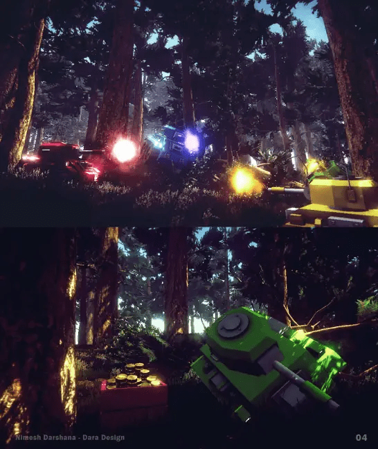 TANKSHOOT is an action-oriented game environment designed to balance performance and visual depth. The project focuses on a dense forest setting where vibrant, low-poly armored vehicles engage in high-stakes combat. By combining simplified geometric models with advanced environmental rendering, I created a space that feels both nostalgic and modern, optimized for smooth gameplay without sacrificing its cinematic “pop”.